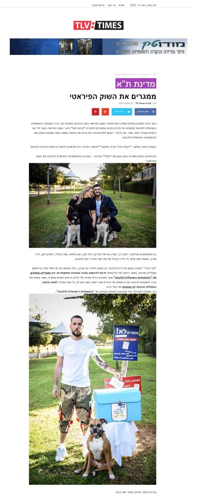 אתר TLV-TIMES מדבר על הקמפיין רשת למיגור השוק הפירטי בענף הכלבים הגזעיים תוך הכרה לעמותת ההתאחדות הישראלית לכלבנות.